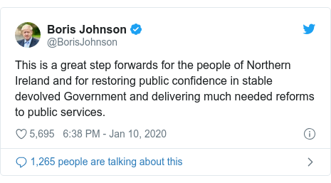 Prime Minister Boris Johnson welcomed the agreement, tweeting it was a “great step forwards for the people of Northern Ireland”.